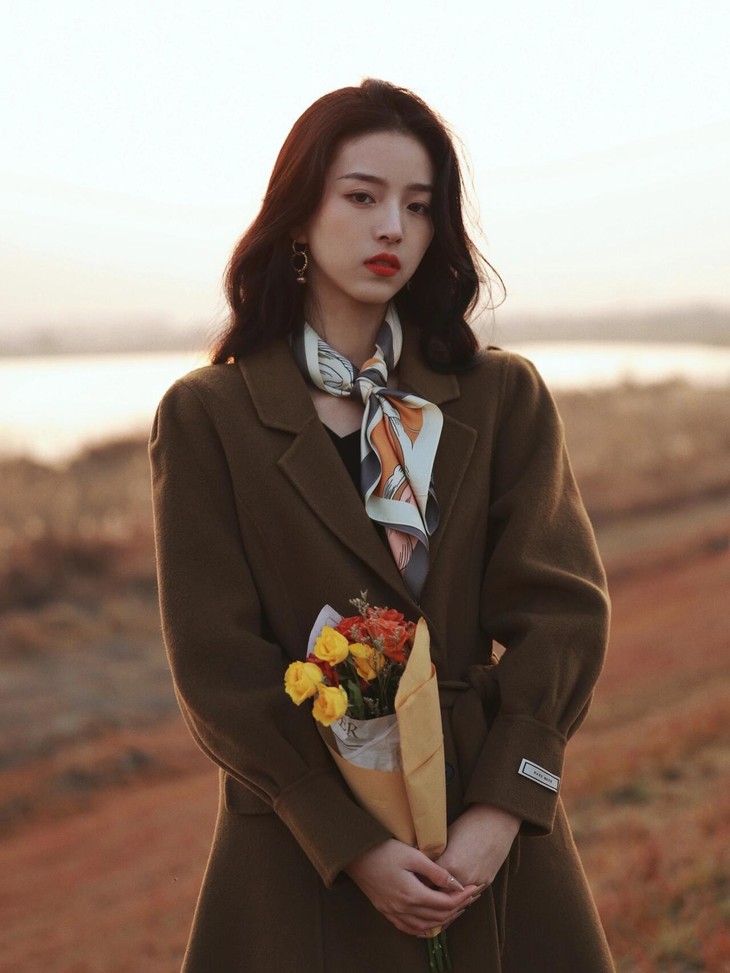 夕阳,“配上质感超好的大衣 配上亮色丝巾中简直是天作之合”