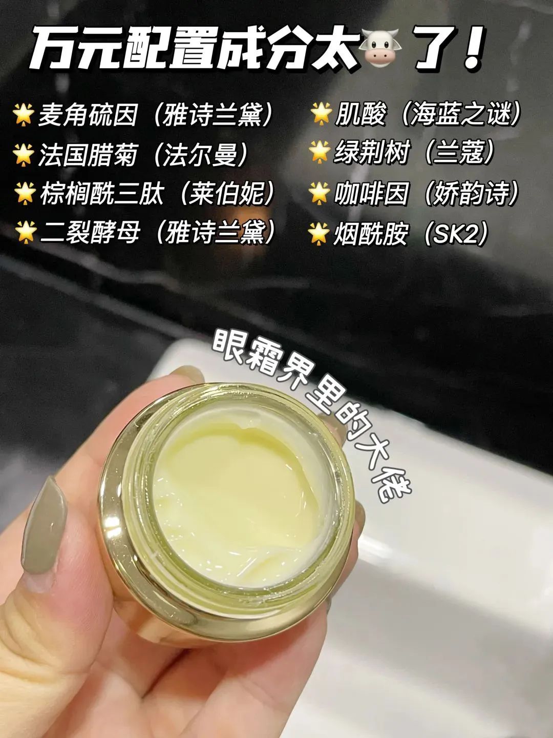 红蝎肽并不是从蝎子中提取的成分,而是通过模拟蝎毒序列,纯人工合成的精氨酸/赖氨酸多肽。它的一个主要功效就是,减少我们脸部肌肉的收缩频率,从而做到改善。双胶原肽:乙酰基八肽-3(K皱)+棕榈酰三肽-1(修护),这两种胜肽可以有效抑制促皱信号释放,弥补皮肤自身胶原蛋白的流失,修护肌肤损伤。不仅如此,还有3重追光精粹:咖啡因+麦角硫因松蕈提取物+二裂酵母发酵产物滤液,帮你焕亮眼周。再高配的成分,只有到达肌底发挥作用,才能有效的解决肌肤问题。磷脂的化学组分和细胞膜非常相近,与皮肤有很好的相容性,它可以作为护肤品中活性成分的载体,帮助有效成分快速透过表皮,直达肌底,让营养被皮肤吸收。连续使用一段时间后,能感觉整个眼部肌肤有一种被向上拉起来的感觉~质地是淡淡的鹅黄色炼乳状,润泽而不粘腻,很好推开,上脸之后也不会觉得闷,不会长脂肪粒。因为有了黑科技渗透技术,涂抹后嗖~嗖~嗖就吸收了,一年四季都适用。眼霜还有一股淡淡的玫瑰花香,每次使用,都是沉浸式的SPA感受。保湿能力也巨好,一般我晚上涂完后,第二天起床依旧能感觉到眼周嫩嫩的,润润的,很舒服~我自己因为经常熬夜和化妆的原因,眼周一些干纹和细纹,眼周暗沉,泪沟也明显。用了一段时间后,就有明显的淡化。眼霜使用起来也很方便,取黄豆大小于无名指,均匀的涂抹于眼周按摩吸收即可。女人该投资的地方不能输,况且今天的价格也是划算到爆,官方299元的眼霜,现在只要89元,还送5个1.5g眼霜小样,价值75元!