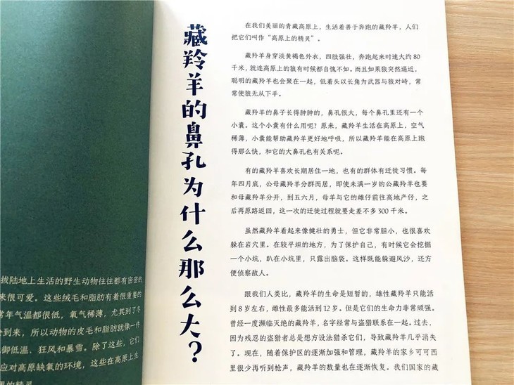 又比如,讲到青藏高原上的藏羚羊,书中用一个问题启发孩子的好奇心:藏羚羊的鼻孔为什么那么大?🔻