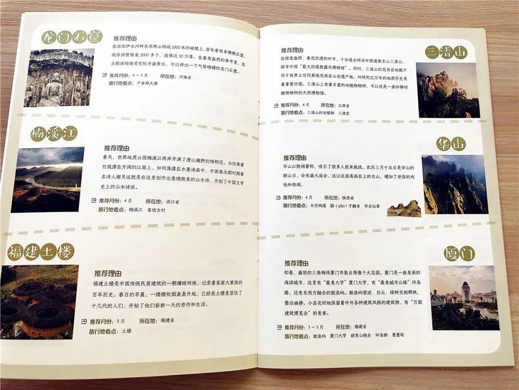 里面精心挑选出60个目的地,每个季节对应15个适宜游玩的地点,推荐的出游月份以及旅行地看点都清楚列出,简直就是一份贴心旅游宝典!