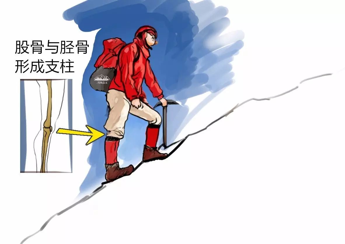 而高山休息步的精髓,就是用骨头代替肌肉承力: