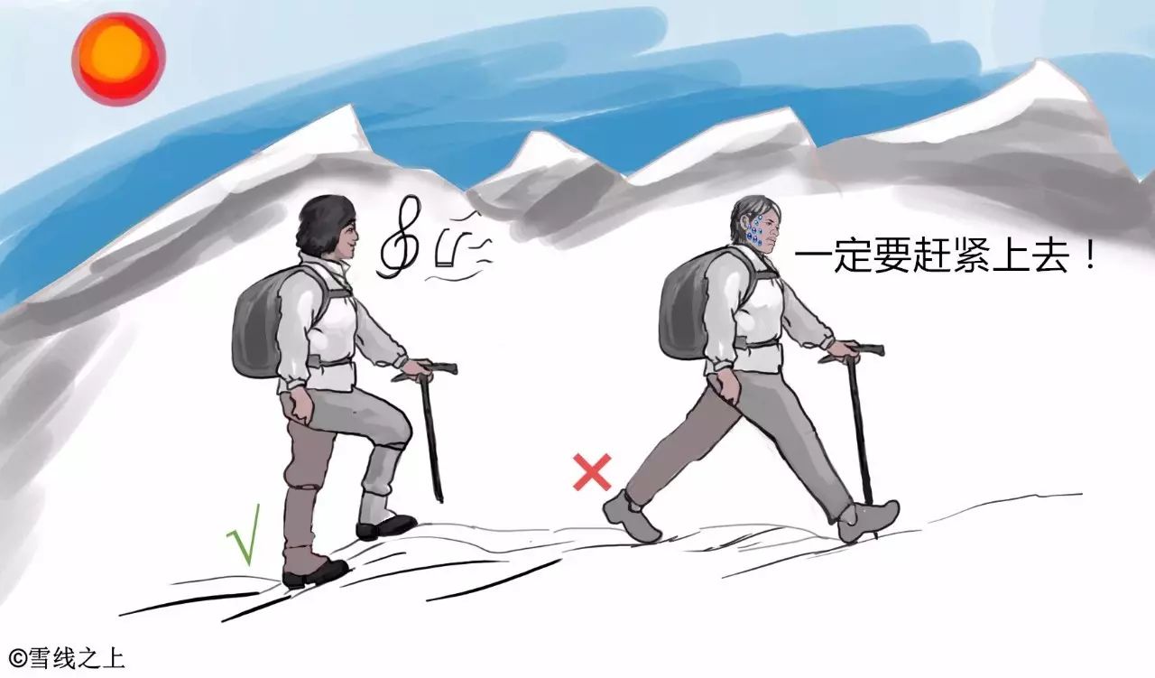 进入空气稀薄地带,面对漫漫长坡,正视缺氧,合理使用高山休息步,用“绵长”代替“刚猛”,将助你成功完成目标。