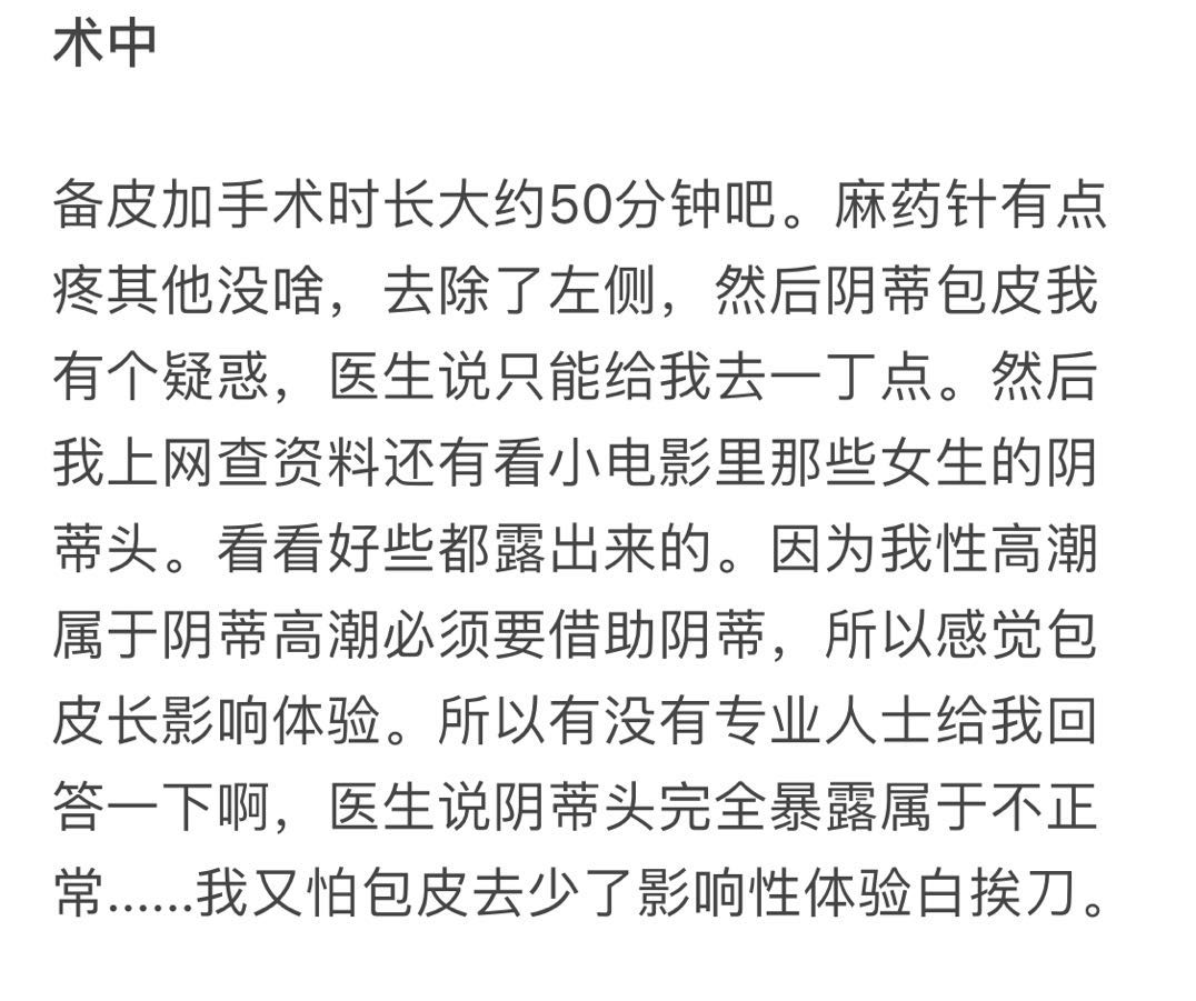 而且自己必须借助音蒂才能高巢,担心包皮太长影响「性」体验,所以找了一家医院做包皮手术。