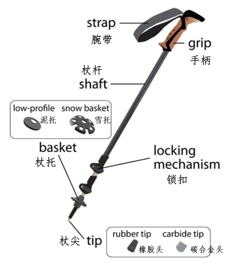 直到20世纪70年代,登山杖才从滑雪运动中的雪杖脱离,自成一派,应用于各种山地户外运动。现代登山杖由六部分组成: