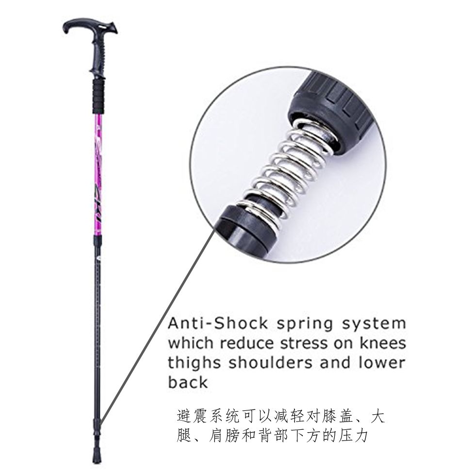 避震系统是在登山杖的内部设有弹簧,在受力时起缓冲作用。上坡时关掉避震可以获得更大的推力,下坡时避震系统可以很好地保护膝关节。