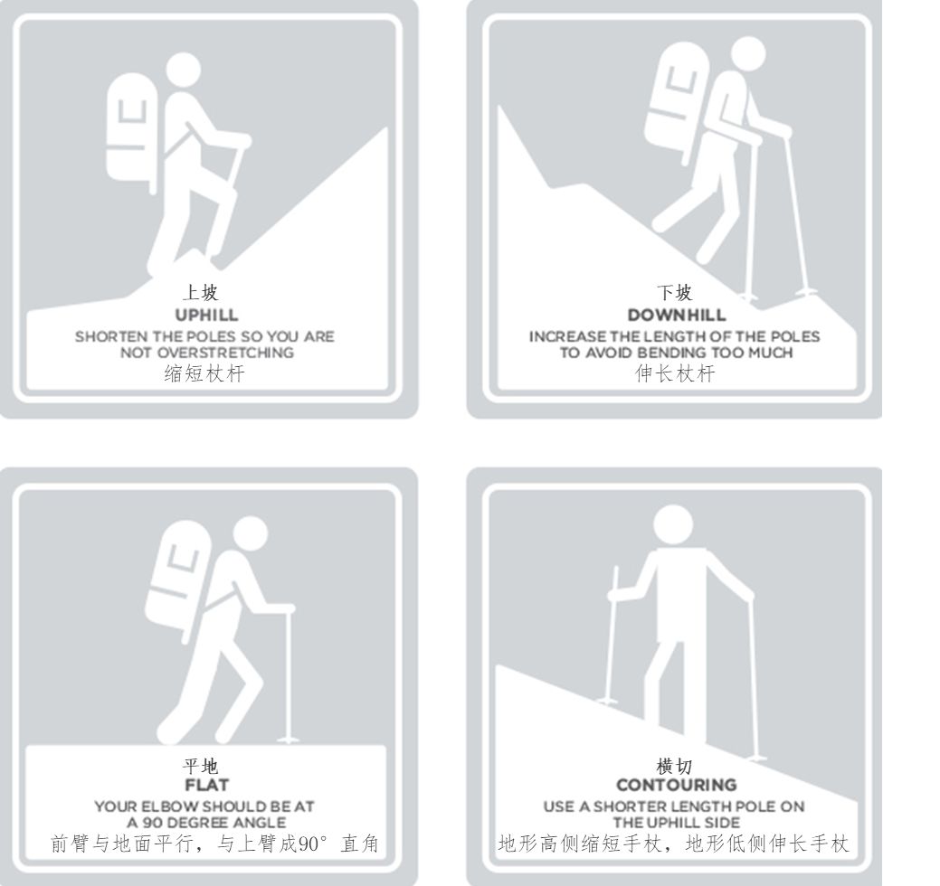 登山杖“能伸能缩”的设计为不同地形而生,合理利用登山杖的不同高度有助于行走效率的提高: