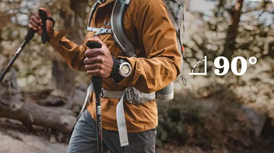 虎口应呈半圆形,使登山杖可以像钟摆一样前后摆动。使用时向下发力,让腕带的承力传向全身,放松并保护手腕。
