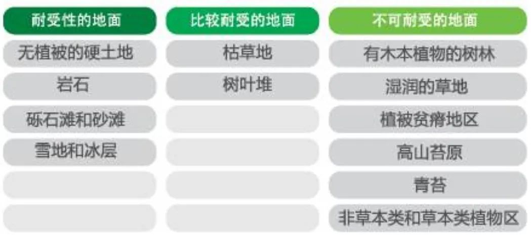 在偏远的自然地区,分散建设营地,留出缓冲地带,避免对地面及植被的过度践踏。