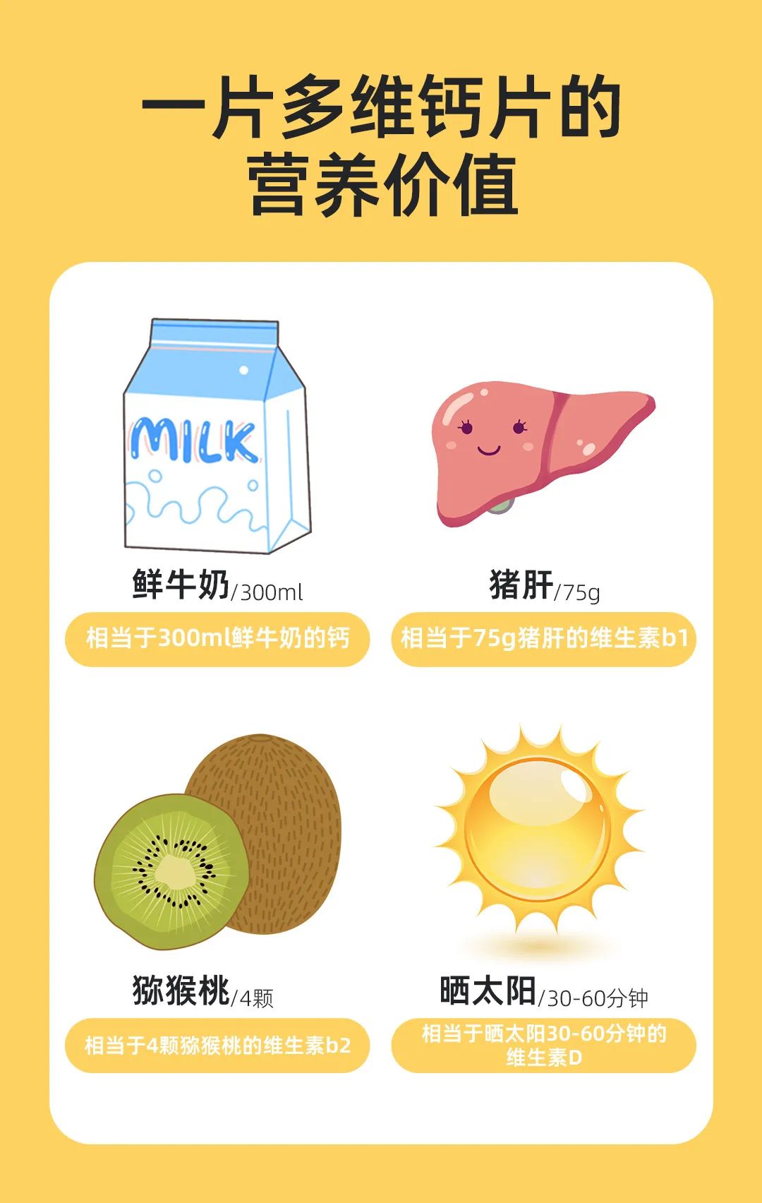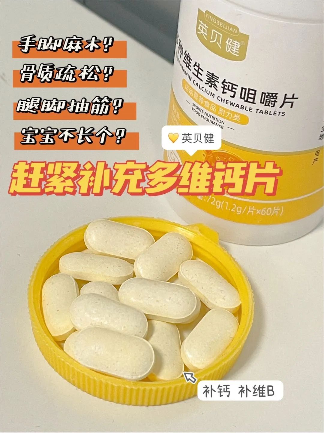 这个多维钙,真的让人无法拒绝,嚼1片英贝健多种维生素=🥛300ml鲜牛奶的钙➕🐮75g猪肝的维生素B1➕🥝4颗猕猴桃的维生素b2➕🌞30-60分钟的晒太阳的维生素D!!!小孩偏食挑食、上班族吃外卖,老人营养不够,每天吃一片,营养满格✔️