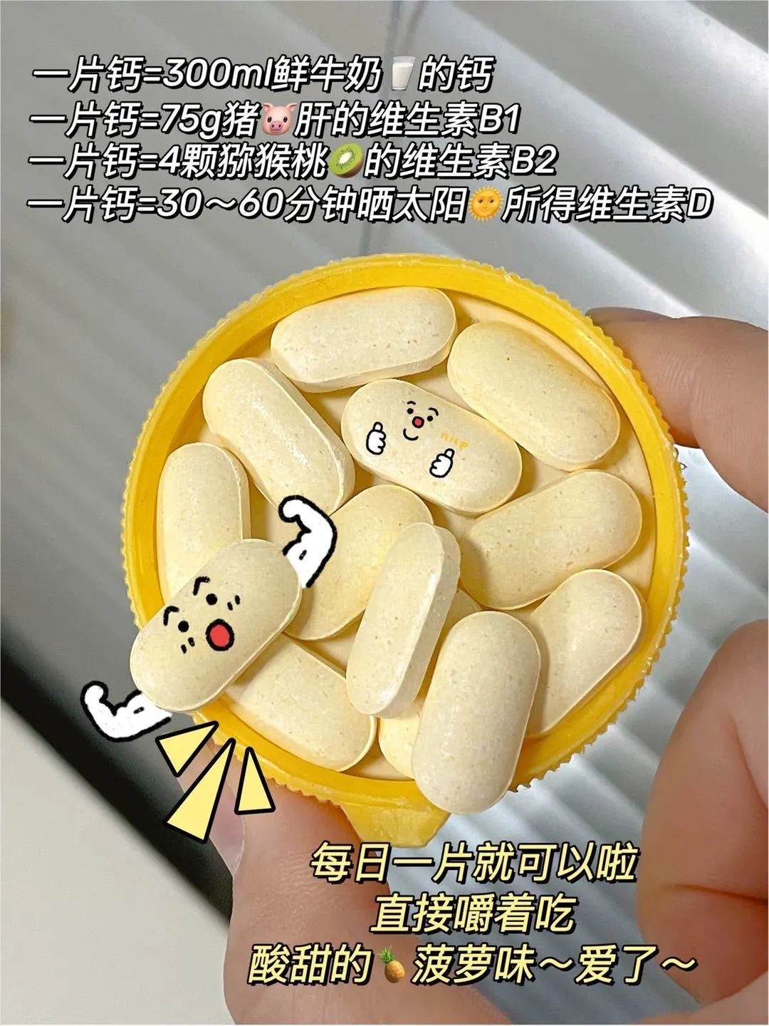 钙片中的天花板🤩钙➕超多维生素🤩 保证每1mg的钙都补进骨骼里!这个吃起来菠萝味在嘴里爆炸的感觉💥💥 💥像在吃整个菠萝🍍酸甜清爽!🔥爱了爱了,这个钙片适合全家一起吃😋