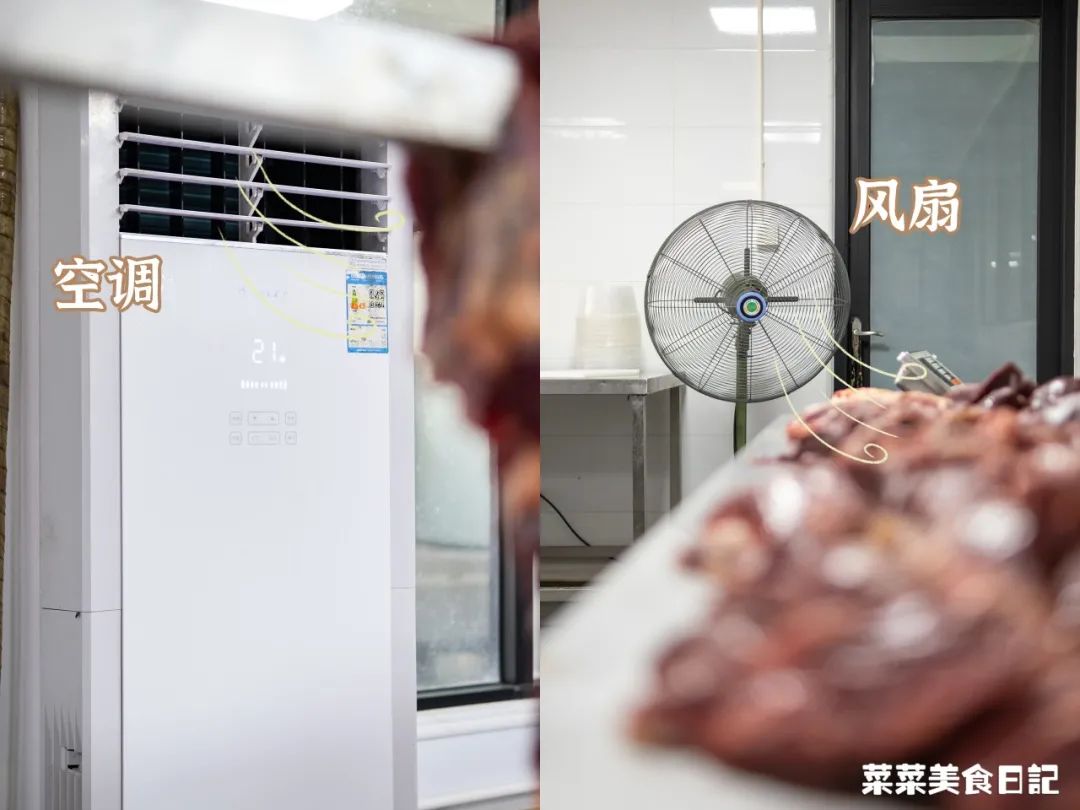 送到车间的牛肉还要摊开晾起,在空调和风扇的较低温度中,维持牛肉的活性,后续打浆才会起胶有粘性。