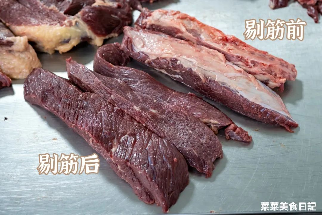 牛后腿肉扎实,筋膜多,制作前还要经过师傅剔拣,将筋膜和脂肪剔掉,力求干净、手快。