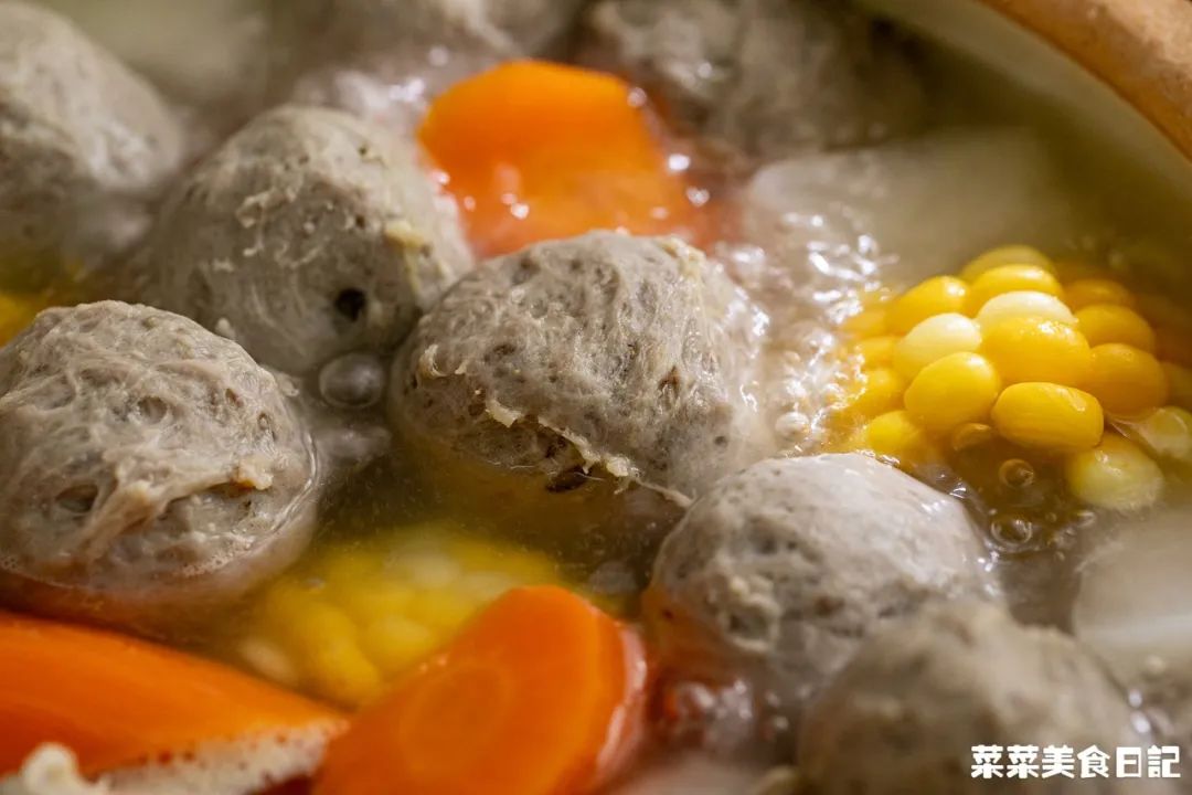 最简单吃法,是像汕头牛肉火锅一样,用萝卜、玉米、骨汤打底,先放入几颗牛肉丸铺垫。