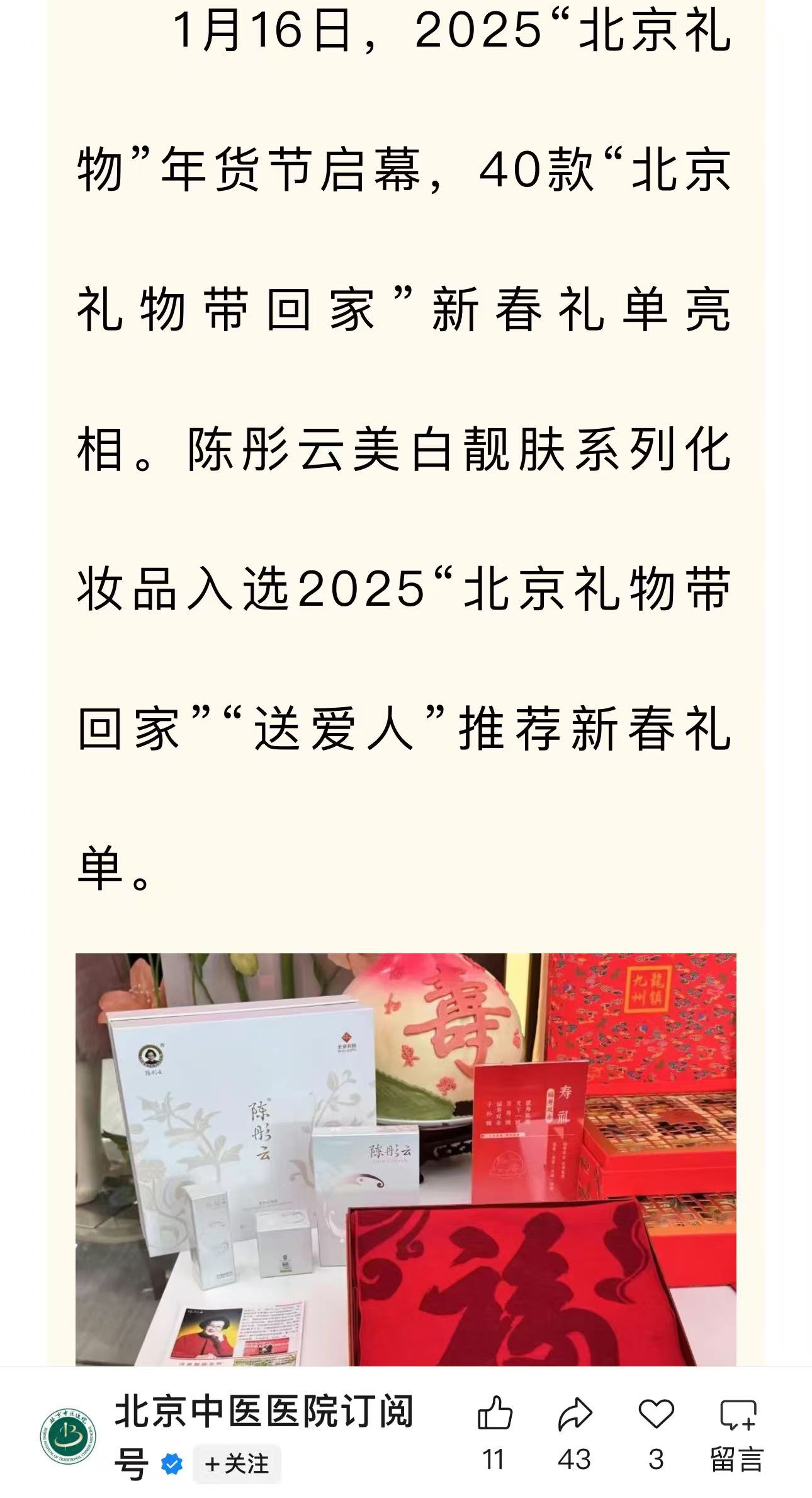 自2019年以来,陈彤云系列化妆品多次入选“北京礼物”名单。作为“北京礼物”年货节的代表之一。
