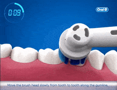 ☉ 刷牙时:将刷头贴近最薄的门牙,来回拉动,注意不要用力过猛。待牙膏起泡后,打开电动开关,刷头震动后适度用力,从门牙开始向后牙来回移动牙刷,每个区间刷30秒左右,两分钟即可清洁所有牙齿。