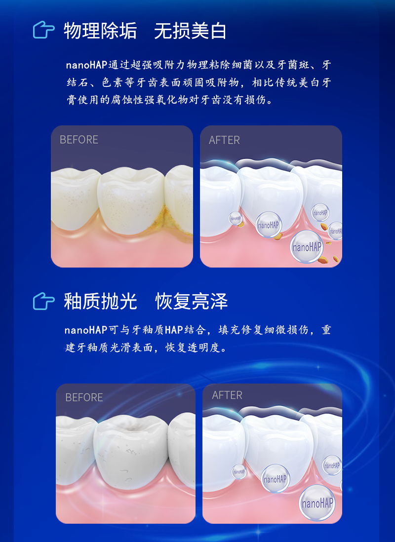 nanoHAP的特性:白色无味,安全可食用;与色素结合力强,吸附细菌能力强,消炎止血效果显著,抑制有害菌能力强,与牙釉质、牙本质亲和性高,防龋功能强。