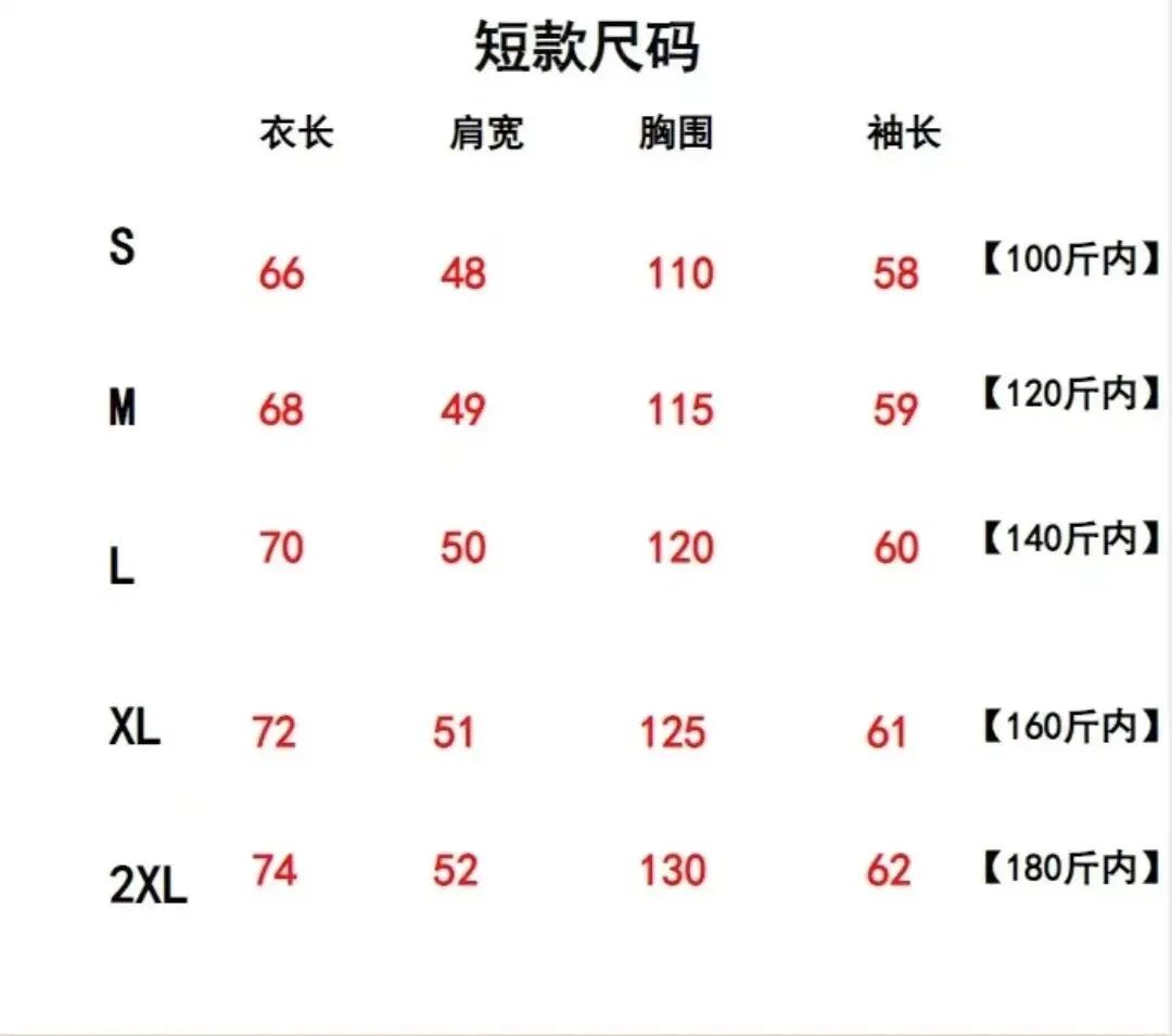 成人短款:S-235g、M-250g、L-265g、XL-280g、2XL-295g;