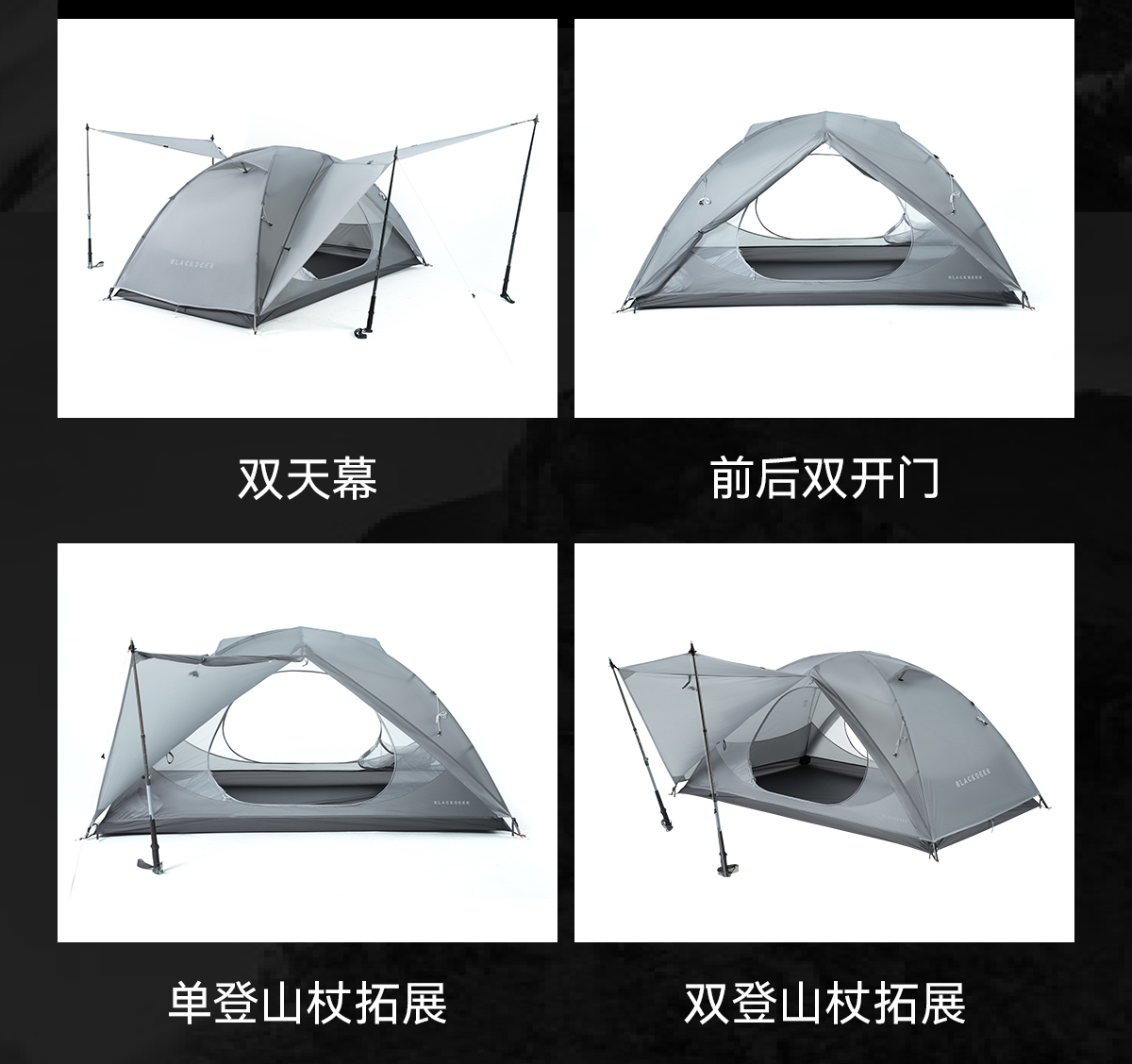 两侧都可搭配登山杖展开,作为天幕使用,提供3.6平米的拓展空间。
