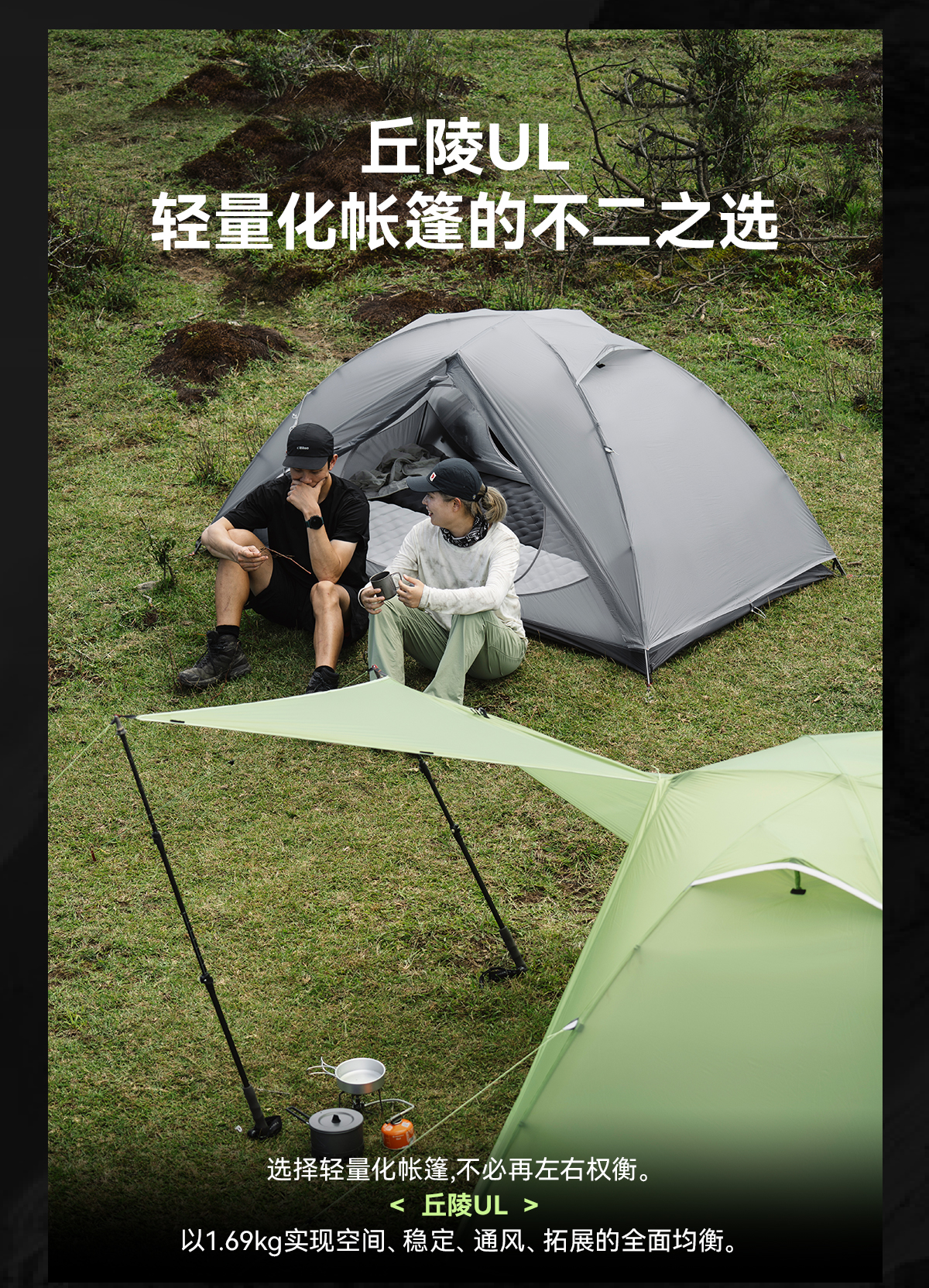 全新的丘陵采用15D的涂硅面料,搭配上各种轻量配件,保证空间舒适的前提下,将双人款式控制在了1.69KG,对比市面普遍两公斤的产品,千元内这个重量绝对是第一梯队的存在。