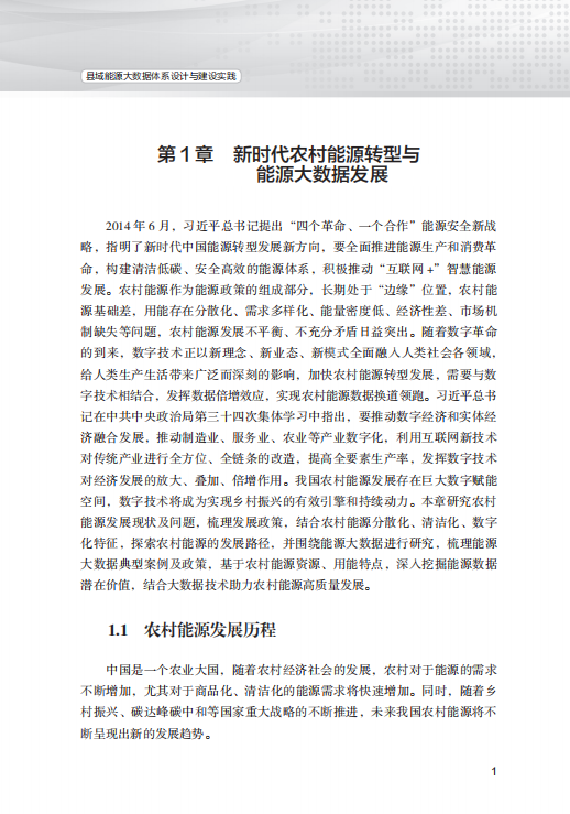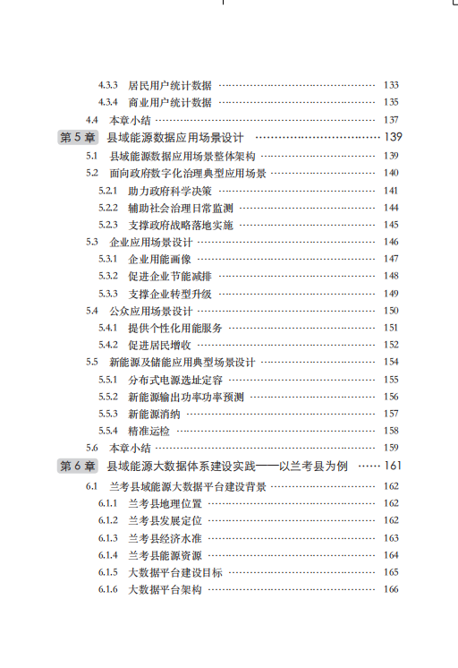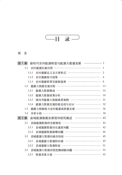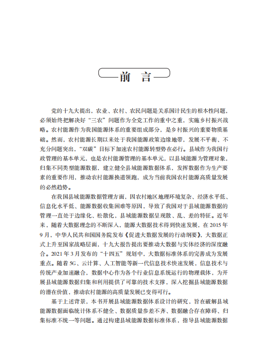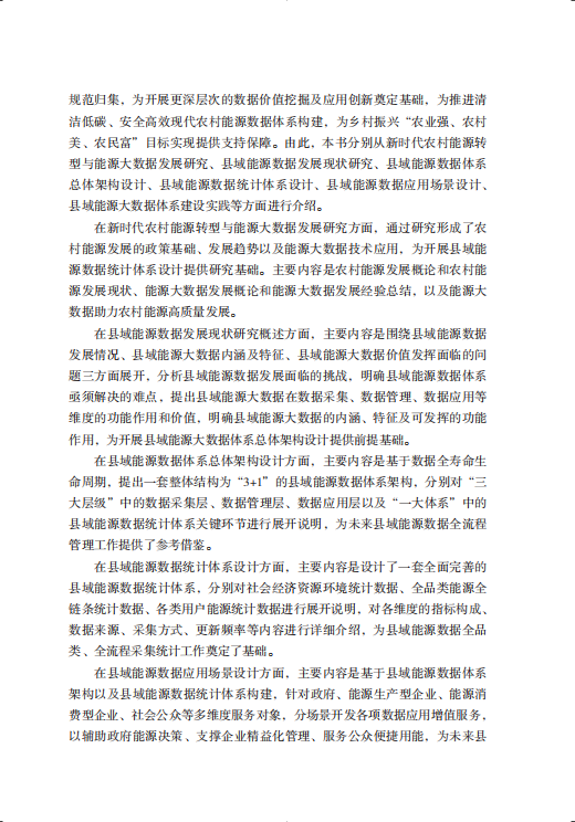 本书共6章,分别从新时代农村能源转型与能源大数据发展研究、县域能源数据发展现状研究、县域能源数据体系总体架构设计、县域能源数据统计体系设计、县域能源数据应用场景设计、县域能源大数据体系建设实践等方面进行介绍。