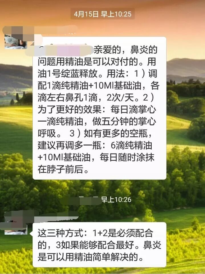 方法三:1滴1号【绽蓝释放】纯精油+10ml基础油,鼻塞时,滴在左右鼻孔各一滴。
