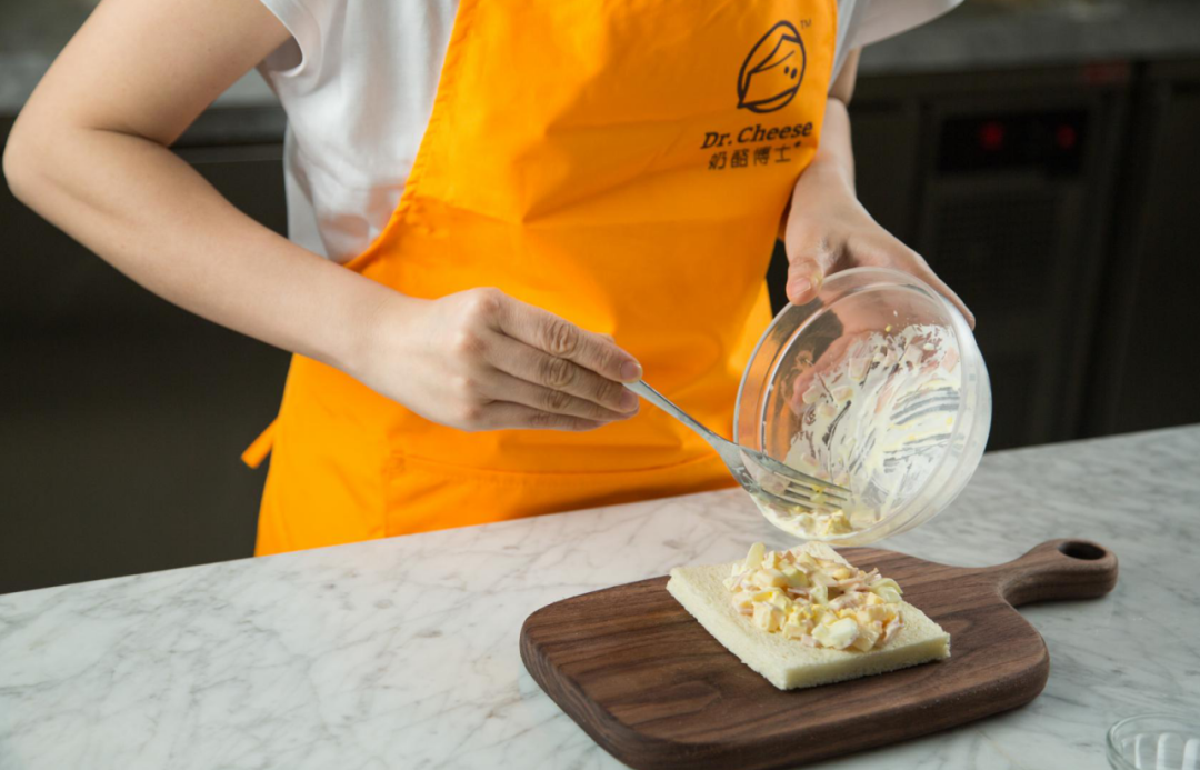 2.在馅料中加入少量酸奶代替沙拉酱,把馅料铺在吐司上。