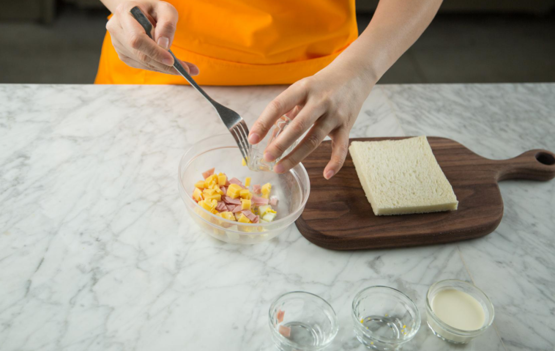 1.食材准备。把火腿、白煮蛋、小圆奶酪切碎,倒入一个碗中。吐司去边。
