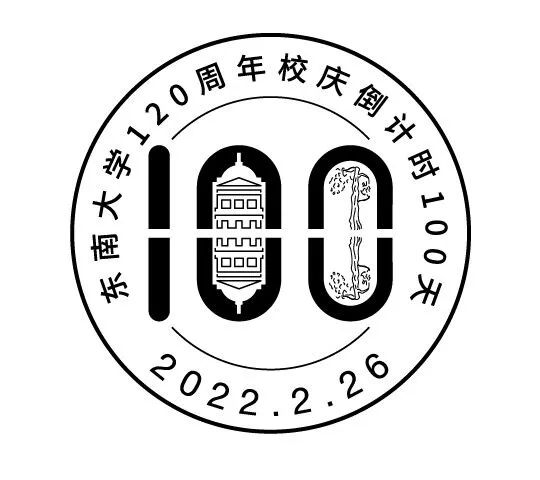 南京邮政特别为东南大学120周年校庆倒计时100天设计了纪念邮戳。“100”字样里同样融入了大礼堂和六朝松两样标志性元素。