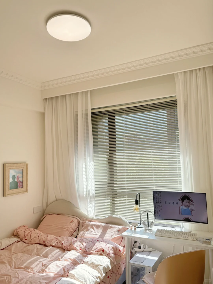 平时居家办公呆在书房的时间是最长的,所以在这间房间的设计上花了很多心思~房间的灯光我格外重视,毕竟是平时用来办公的地方,除了外观颜值会格外关注灯具的护眼效果,做了好多功课后,选择了欧普呵护光护眼吸顶灯。简约的外观跟房间整体装修很搭,看过去非常有质感~