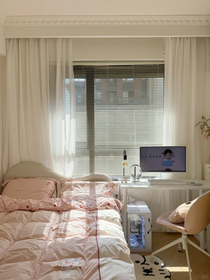 关于儿童房改造✨房间尺寸:3.3x2.89m✨通刷的珍珠白乳胶漆~✨奶油色百叶帘搭配一层白色纱帘,有阳光照进来的时候整个房间都变温柔了✨一米的书桌搭配8格柜,收纳满满~✨一张1.5米的床,工作累了,可以躺着休息,客人来也可以住~很喜欢布置的满满当当的感觉~在里面工作也是治愈的!