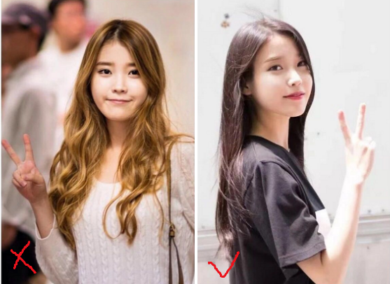 IU娃娃脸,黄头发太亮,压制了她的灵气,换成茶棕get到了元气女孩的feel~还特别显温柔~~