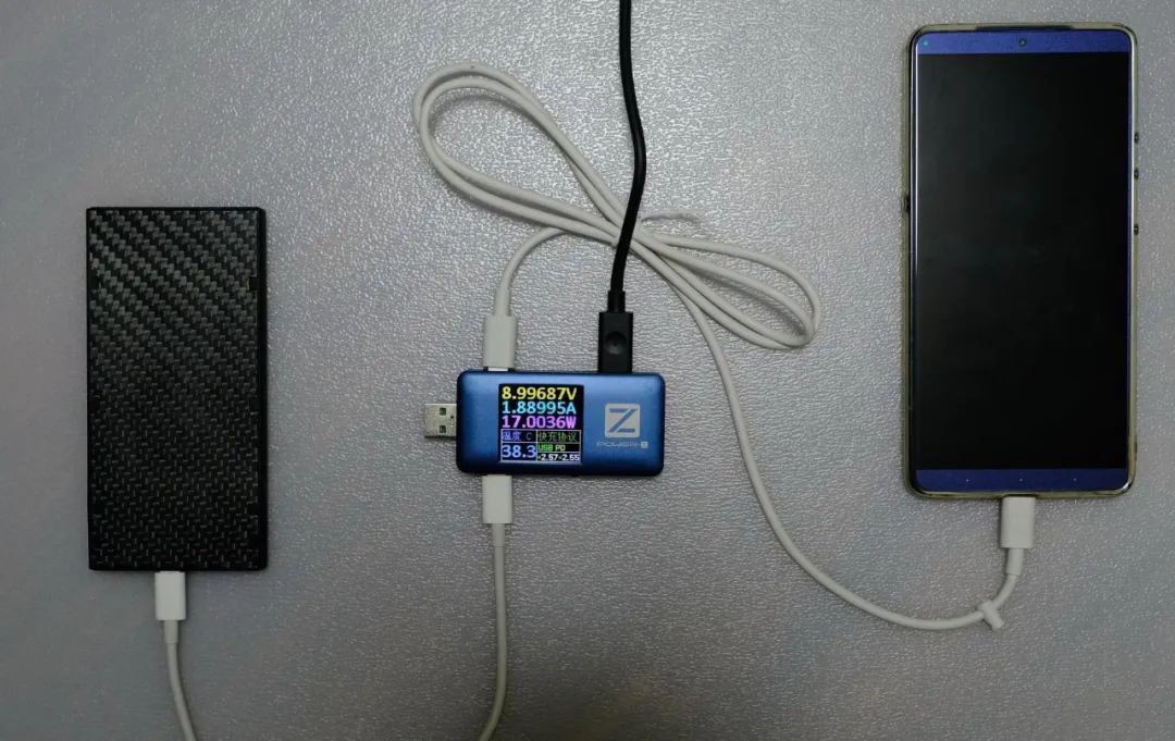 使用NB10000和紫米C to C线充坚果Pro2S手机。实测输出电压8.99V,电流1.89A,输出功率17W。