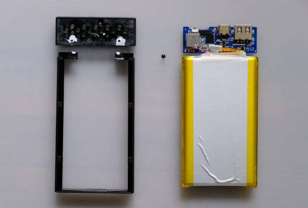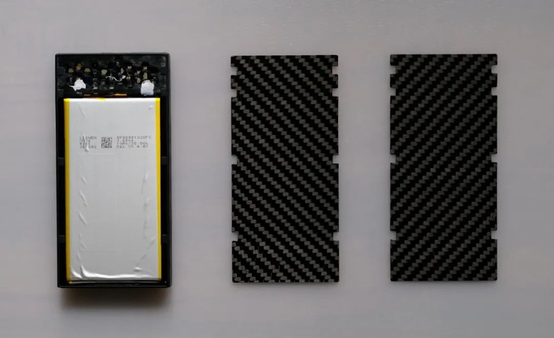 撕掉两块碳纤维板之后就看到塑料框架和电芯。
