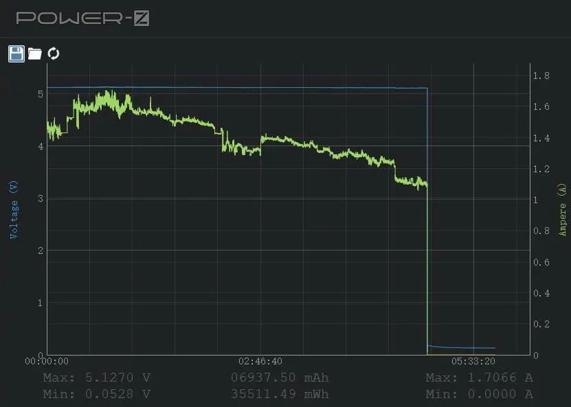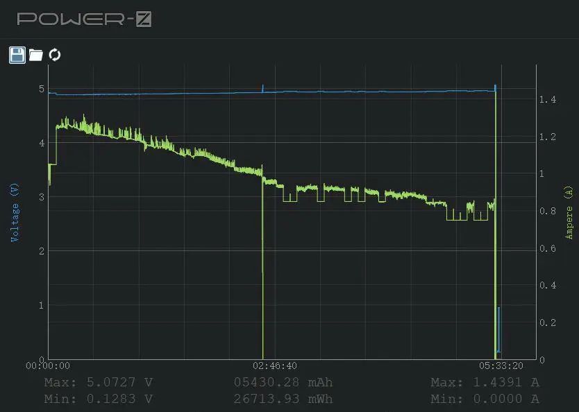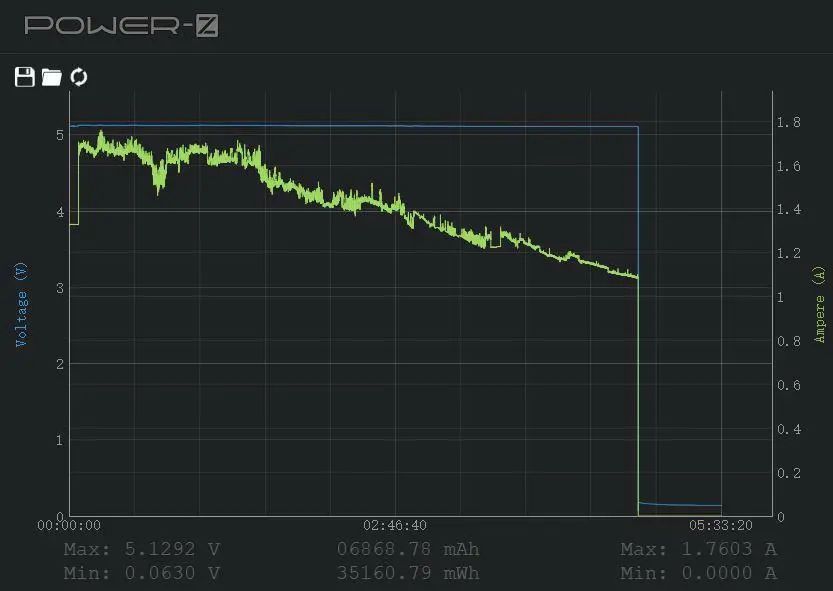 2, 实测输出容量约为35.16Wh,超过产品上标注的额定容量32Wh,标的保守一些估计是为了预留电芯损耗的余量。