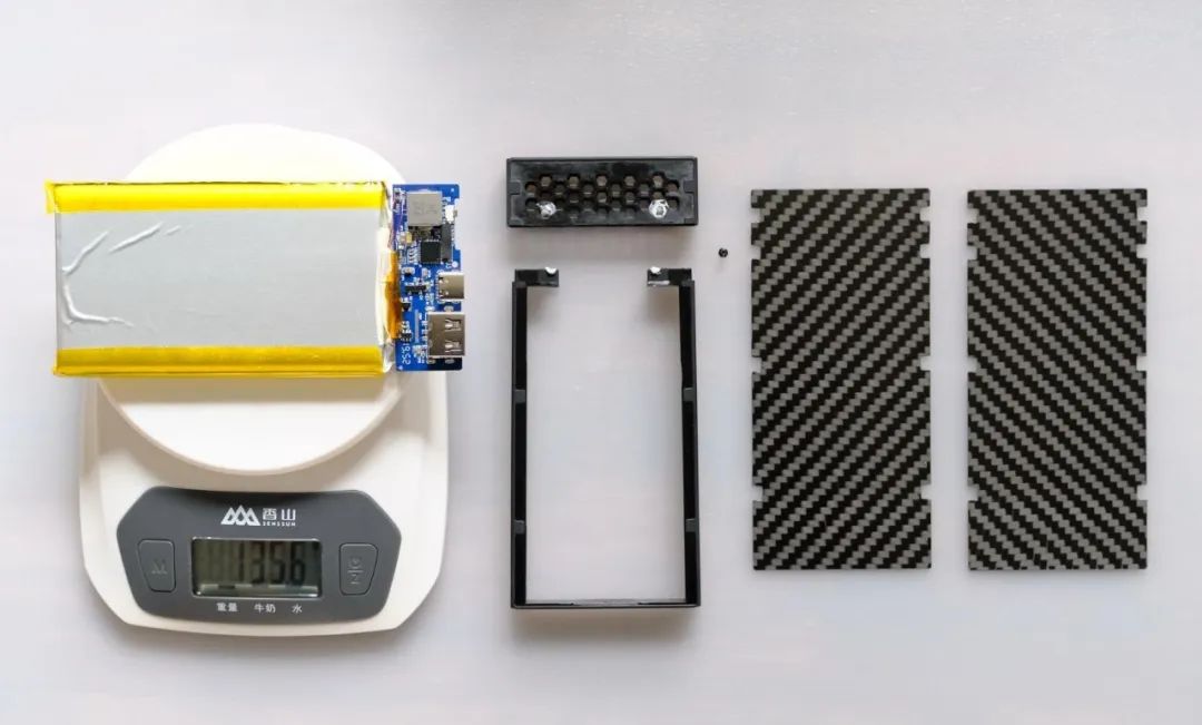 电芯+电路板的重量是135.6g,框架+碳纤维板+螺丝仅重13.6g,居然只用这点重量就做到了像砖块一样扎实的手感。