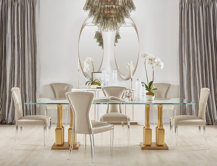 Villa餐桌整体散发出高贵的气息,雕塑般稳重的古铜色桌腿设计,灵感来自欧洲豪华别墅建筑的古典柱式装饰风格,与轻盈的玻璃桌面形成对比视觉效果,椅子造型大胆,纤细精致的座椅靠背与亚克力材质的椅腿平衡了桌子的庄重感。