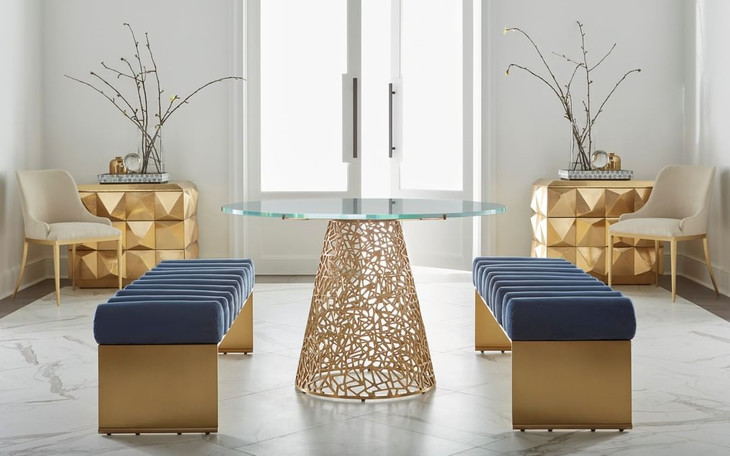 Filigree 餐桌灵感来自珠宝中的戒指多维层次结构,不规则的黄铜拼接由匠心手工打造,玻璃桌面平衡了视觉重点,细致地呈现雕塑般立体透视的效果,与闪耀夺目的金字塔形元素边柜触发空间艺术感。