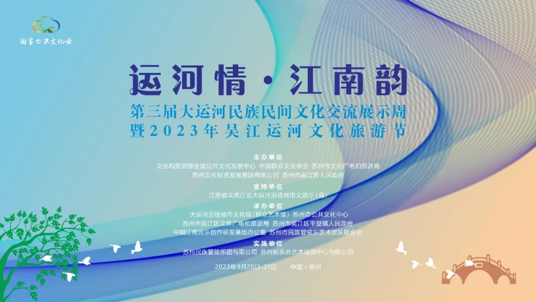 本次活动由文化和旅游部公共服务司指导,文化和旅游部全国公共文化发展中心、中国群众文化学会、苏州市文化广电和旅游局、苏州文化投资发展集团有限公司、苏州市吴江区人民政府主办,江苏省文旅厅及大运河沿线省市文旅厅(局)支持,大运河沿线省市文化馆(群众艺术馆)、苏州市公共文化中心、苏州市吴江区文体广电和旅游局、苏州市吴江区平望镇人民政府、中国江南音乐创作研发基地办公室、苏州市民族管弦乐艺术团队联合会承办,苏州民族管弦乐团、苏州新乐府艺术培训中心有限公司协办,将进一步做优做强大运河沿线地区优秀民族民间文化特色,为人民群众献上汇集运河沿线地区文化精华的艺术盛宴,充分展现新时代群众文化创新创造成果。