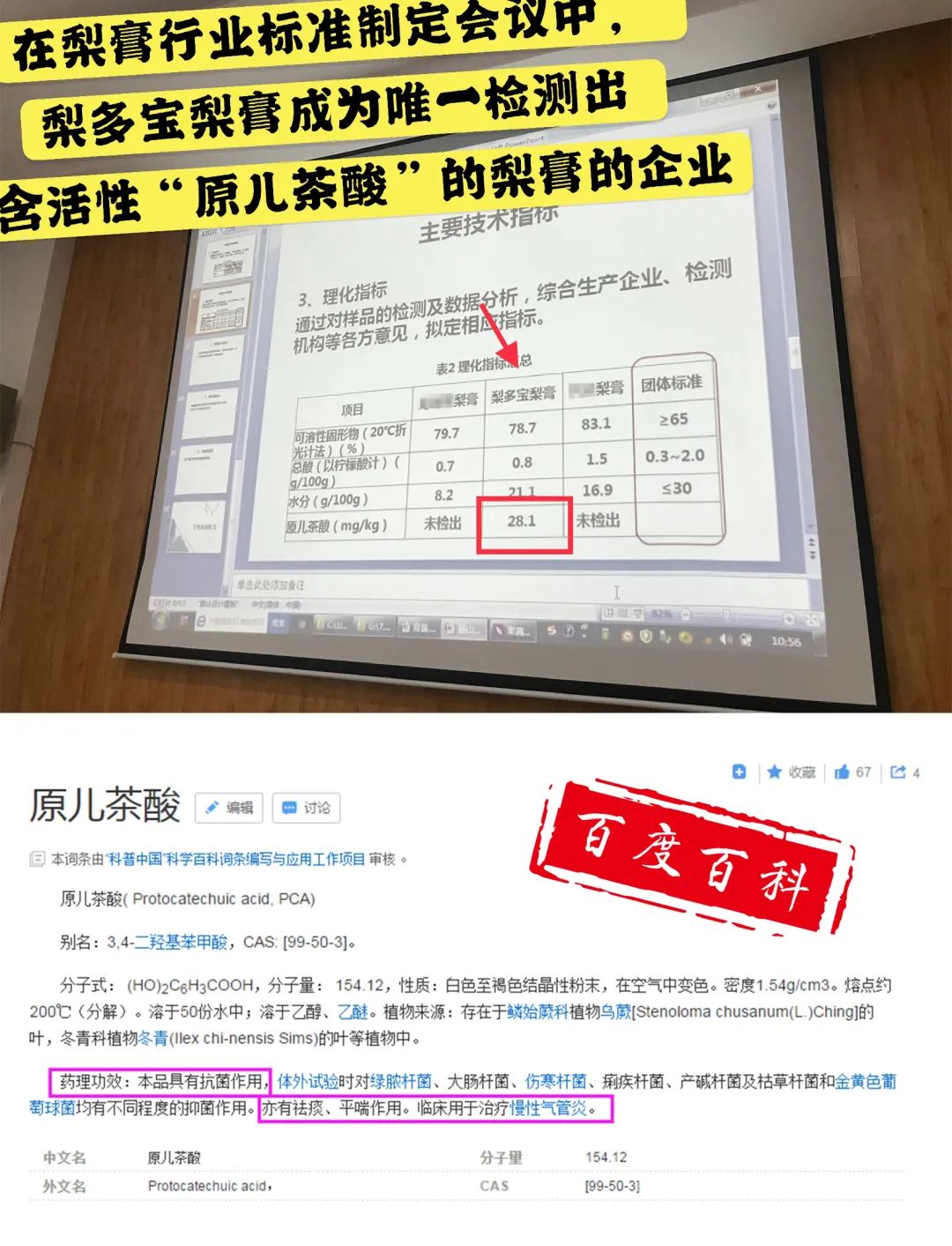 因为在生产过程中,做到足够专业严谨,梨花猫还是唯一检测到含完整活性“原儿茶酸”的梨膏!