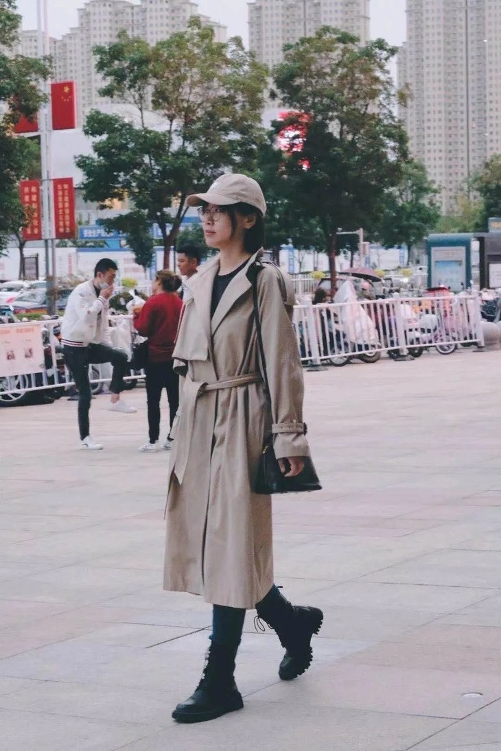 长至小腿的风衣,搭配上靴筒长度恰当的马丁靴,小黑裤显瘦高级,整身搭配简单时尚。