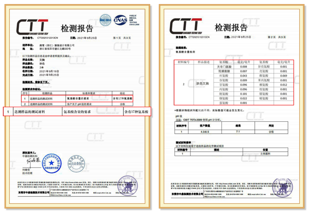 整件内衣多了17种氨基酸的养护效果,不是品牌方盲吹,而是能切切实实拿得出正规的检测报告: