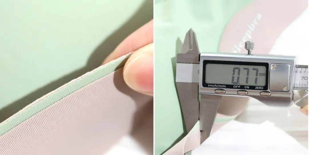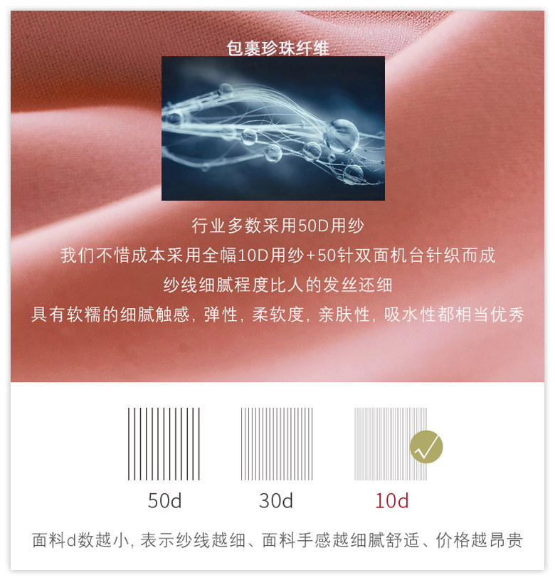 普通内衣多采用50D用纱,而它采用的是「全幅10D用纱+50针双面机台针织而成 」(D数越小,纱线越细腻,但成本越高)