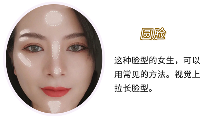 所以圆脸妹子打高光就要强调线条感和拉长,通过延伸长度让脸显得更窄一些。这时候就可以斜着打高光,并且在下巴最低处也强调一下,视觉上拉长自己的脸型~