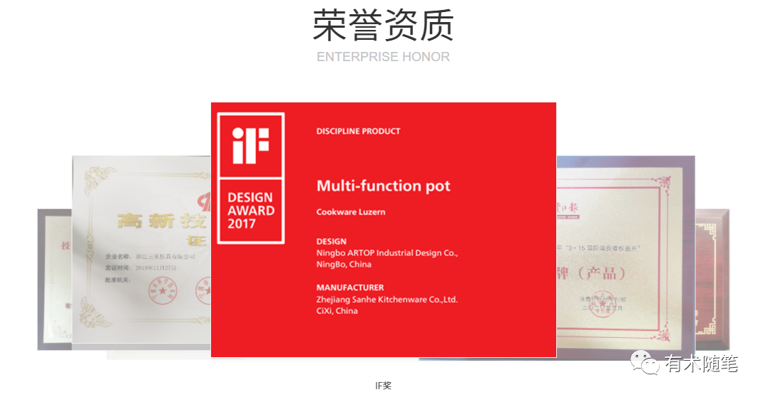 先后荣获法国巴黎DNA设计大奖 、德国IF设计大奖、中国不粘锅名牌、中国家电磐石奖、全国匠心品牌、浙江出口名牌等多项权威奖项。通过CNAS(中国合格评定国家认可委员会认证)、IAF(国际认可论坛认证)、TUV(德国TUV认证)等国际权威管理机构认证,是国家认证的不粘锅和铁锅的起草单位之一。
