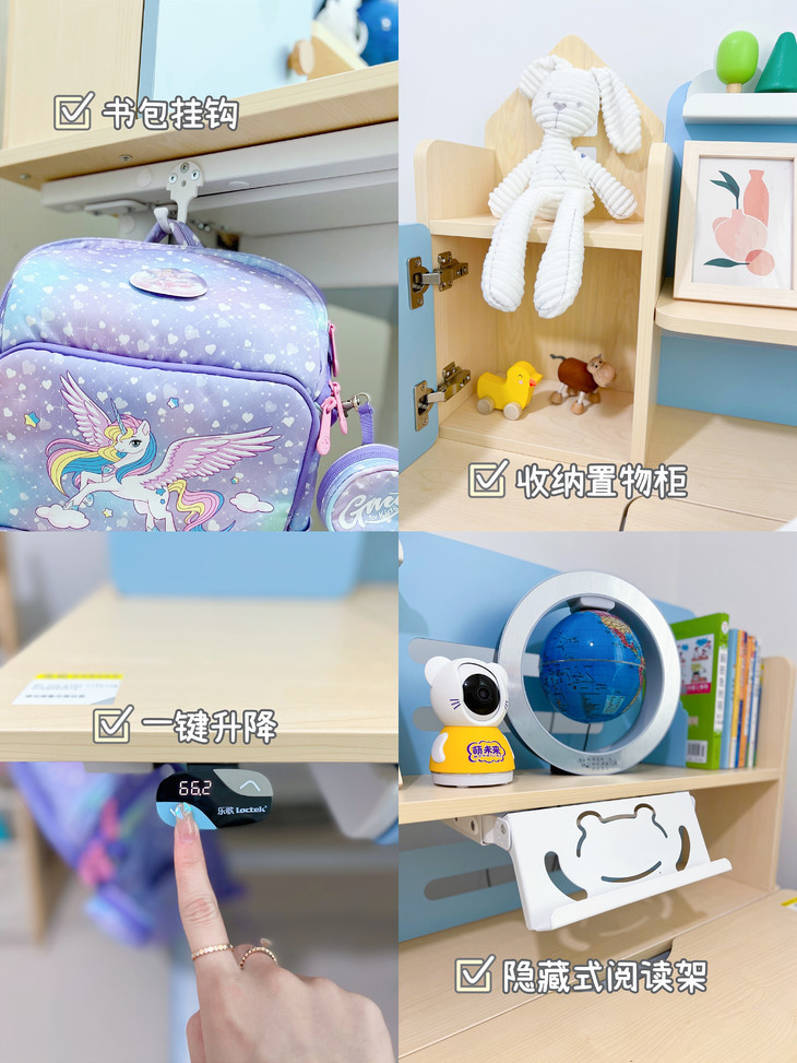 ✅桌子自带小书架,可以放一些读物和小摆饰什么的,培养孩子收纳!隔板还隐藏了个阅读架子,平时上网课什么的,用起来敲方便~