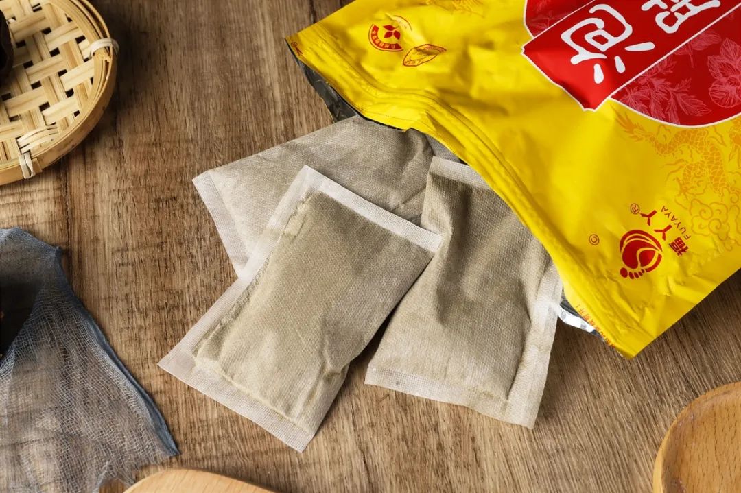 与一般原材原料的泡脚包不同,它是粉末状的,装在无纺布里。