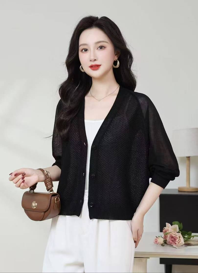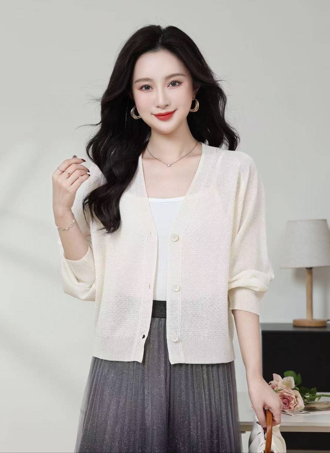 SC1E05 四色双针法毛衫外披,细腻肌理针织面料,轻薄透气不闷汗,V 领 + 落肩设计,修饰脖颈线条,三颗同色系圆扣,简约又高级。