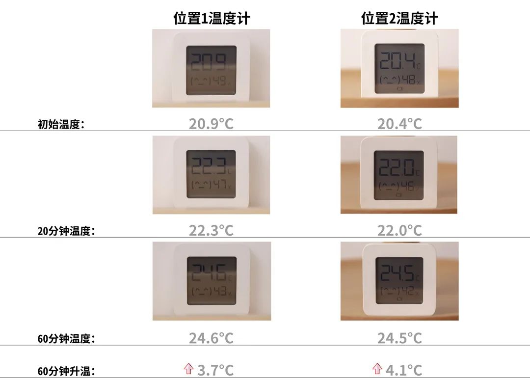 开启智米石墨烯取暖器最大档位,20分钟后,室温升高大约1.5℃,同时2个位置温度更为相近。