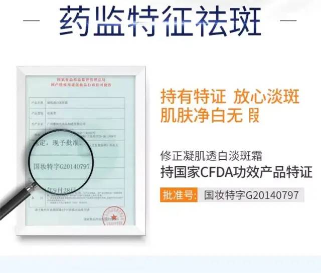 但是修正凝肌透白淡斑霜就不一样,它拥有国家食品药品监督管理,总局颁发的国妆特字G20140797,药监总局认证,持祛斑类特征!国产特殊化妆品行政许可批件!
