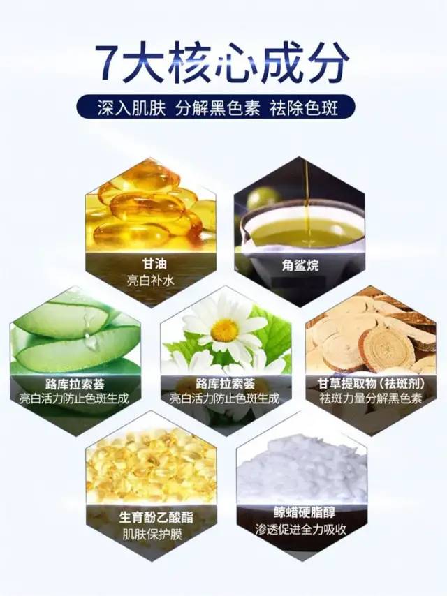 每个成分相互作用,其中角鲨烷,甘油等成分对黄褐斑、晒斑、雀斑、色素沉着,以及“黄气”肤色有很强的去黄祛斑功效。